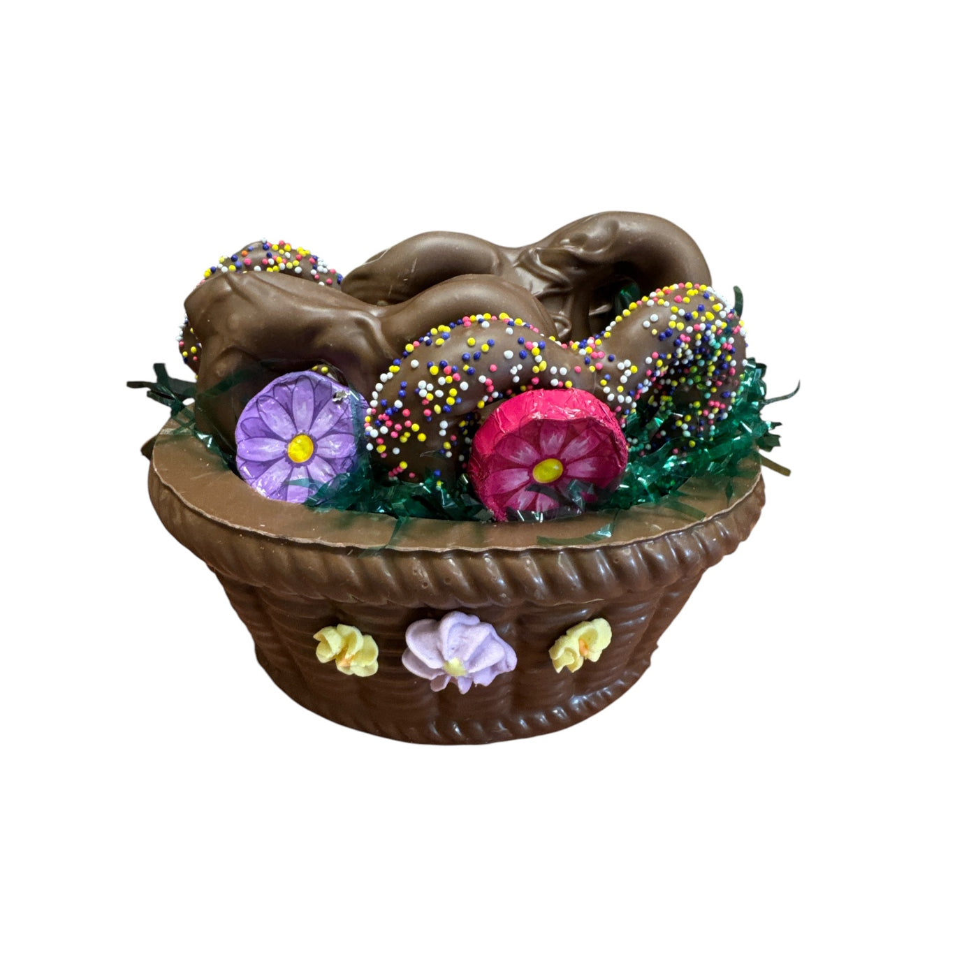Who wouldn't love an all chocolate basket?  The entire gift is edible! The large hollow basket is filled with 8 chocolate covered pretzels.