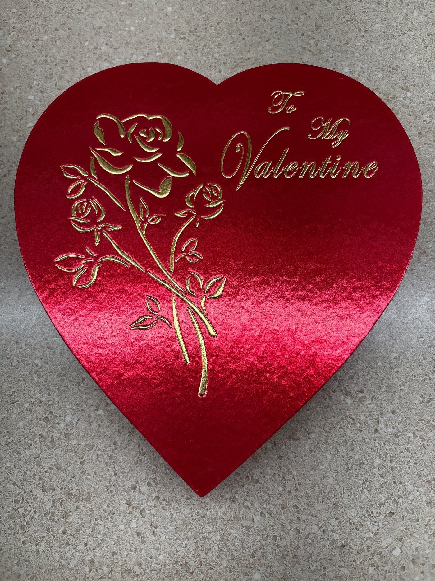 Valentine's Heart Box with "Happy Valentine's Day" on the front. Filled with our signature assortment of milk and dark chocolates.
