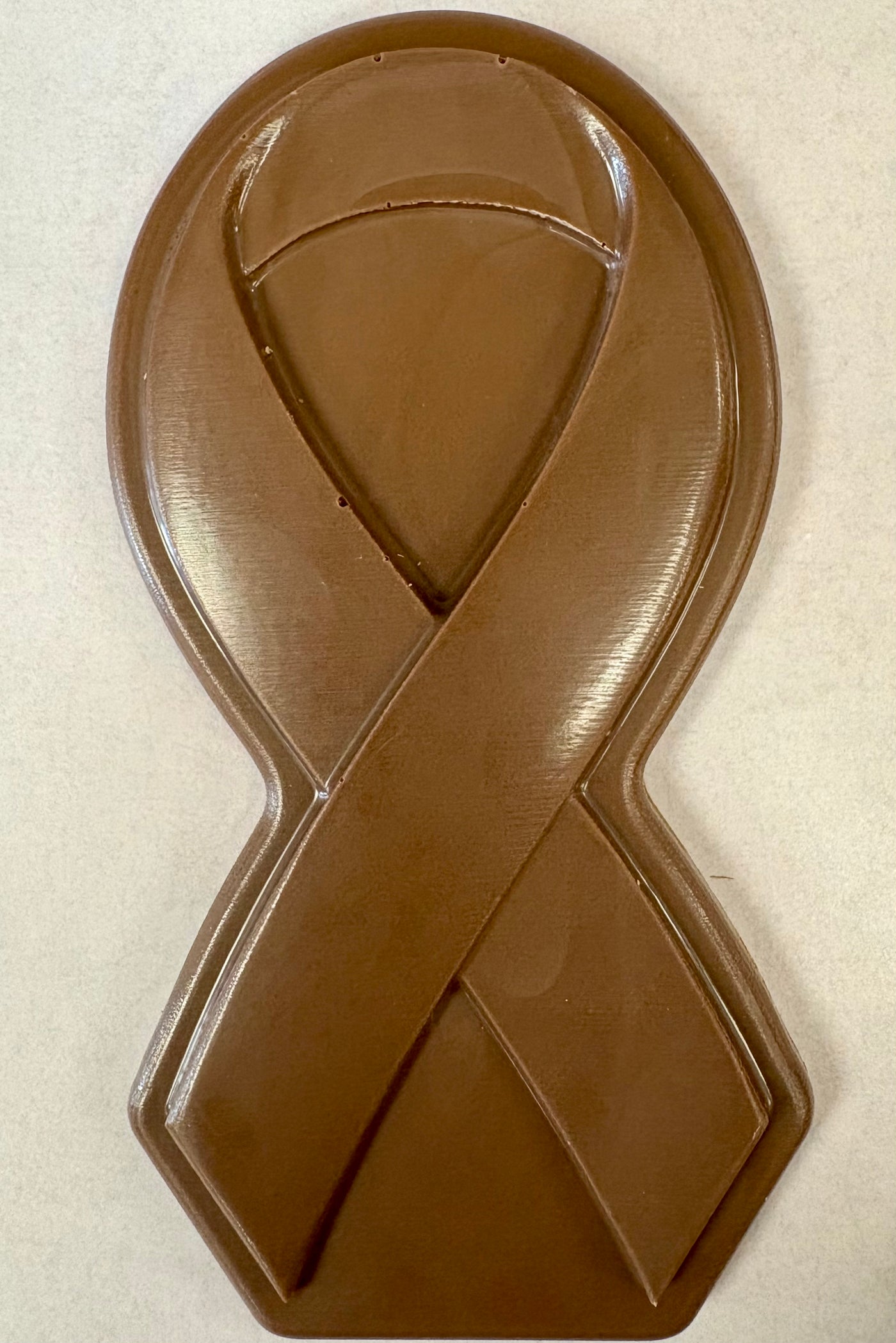 Show your support with our delicious milk chocolate ribbon, beautifully packaged in a clear cellophane bag and tied with a pink ribbon. Decorations vary with each piece.