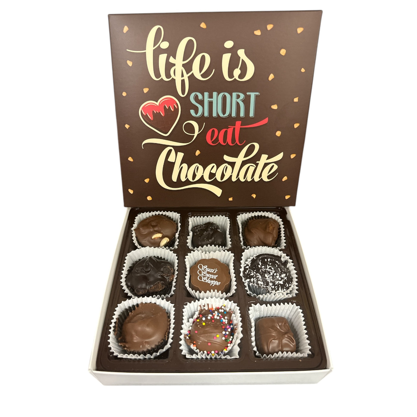 Indulge in our assortment of rich milk and dark chocolate hand-dipped treats, packaged in a 9 piece box with a playful reminder that life is too short to not enjoy the sweeter things, like chocolate!