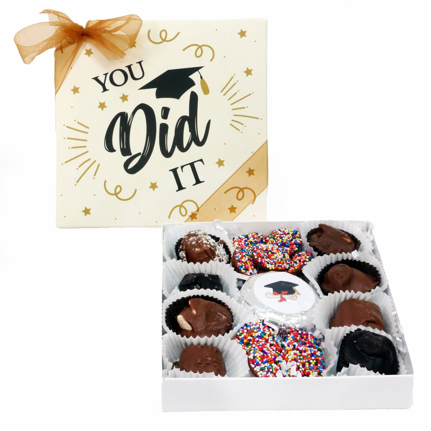 Our Graduation Assortment Box is perfect for any graduate! This expertly crafted box contains 9 unique and delicious hand dipped chocolates, making it the perfect way to celebrate and say "You Did It!" in style.