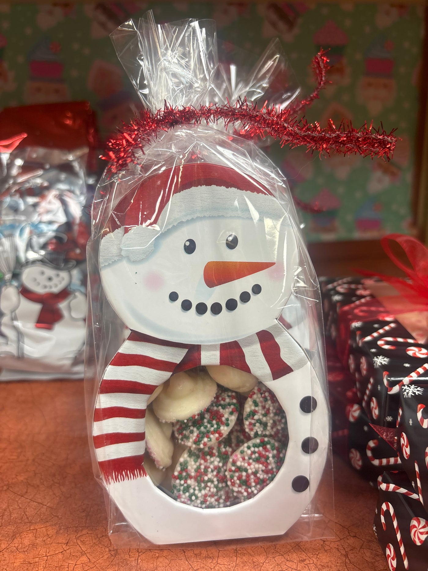 Our White Chocolate Christmas Nonpareils are silky, rich discs coated on the bottom with festive red and green sprinkles for a classic holiday crunch. Presented in a charming snowman-shaped box, they make a sweet and cheerful gift for anyone who loves a little holiday magic.