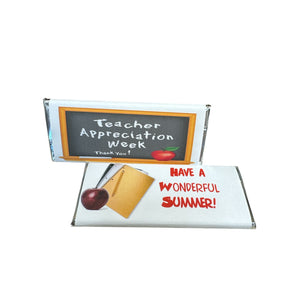 Our hand made chocolate bars are wrapped in silver foil. You can choose between our Teacher Appreciation Week or End of year bars for your teacher.